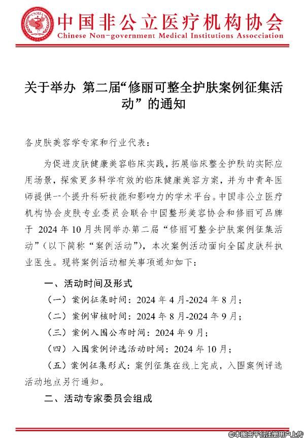 為促進(jìn)皮膚健康美容臨床實(shí)踐,拓展臨床整全護(hù)膚的實(shí)際應(yīng)用場(chǎng)景,探索更多科學(xué)有效的臨床健康美容方案,并為中青年醫(yī)師提供一個(gè)提升科研技能和影響力的學(xué)術(shù)平臺(tái)。中國(guó)非公立醫(yī)療機(jī)構(gòu)協(xié)會(huì)皮膚專業(yè)委員會(huì)聯(lián)合中國(guó)整形美容協(xié)會(huì)和修麗可品牌于 2024年10月共同舉辦第二屆“修麗可整全護(hù)膚案例征集活動(dòng)”(以下簡(jiǎn)稱“案例活動(dòng)”),本次案例活動(dòng)面向全國(guó)皮膚科執(zhí)業(yè)醫(yī)生。現(xiàn)將案例活動(dòng)相關(guān)事項(xiàng)通知如下: