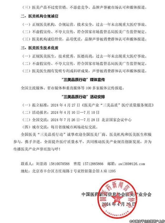 歡迎全國醫(yī)美廠商、醫(yī)美機(jī)構(gòu)和醫(yī)美醫(yī)生積極參與,攜手并進(jìn),全面提升醫(yī)療質(zhì)量水平,共同推動(dòng)醫(yī)美產(chǎn)業(yè)規(guī)范創(chuàng)新發(fā)展,并為傳播醫(yī)美產(chǎn)業(yè)聲譽(yù)而鼓與呼。