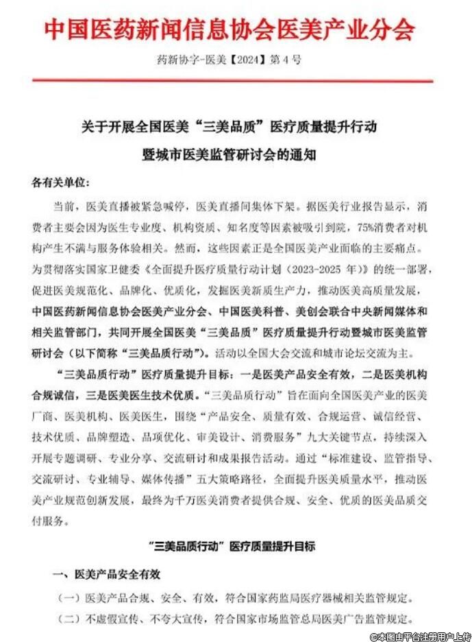 當(dāng)前,醫(yī)美直播被緊急喊停,醫(yī)美直播間集體下架。據(jù)醫(yī)美行業(yè)報(bào)告顯示,消費(fèi)者主要會(huì)因?yàn)獒t(yī)生專業(yè)度、機(jī)構(gòu)資質(zhì)、知名度等因素被吸引到院,75%消費(fèi)者對機(jī)構(gòu)產(chǎn)生不滿與服務(wù)體驗(yàn)相關(guān)。然而,這些因素正是全國醫(yī)美產(chǎn)業(yè)面臨的主要痛點(diǎn)。為貫徹落實(shí)國家衛(wèi)健委《全面提升醫(yī)療質(zhì)量行動(dòng)計(jì)劃(2023-2025年)》的統(tǒng)一部署,促進(jìn)醫(yī)美規(guī)范化、品牌化、優(yōu)質(zhì)化,發(fā)掘醫(yī)美新質(zhì)生產(chǎn)力,推動(dòng)醫(yī)美高質(zhì)量發(fā)展,中國醫(yī)藥新聞信息協(xié)會(huì)醫(yī)美產(chǎn)業(yè)分會(huì)、中國醫(yī)美科普、美創(chuàng)會(huì)聯(lián)合中央新聞媒體和相關(guān)監(jiān)管部門,共同開展全國醫(yī)美“三美品質(zhì)醫(yī)療質(zhì)量提升行動(dòng)暨城市醫(yī)美監(jiān)管研討會(huì)(以下簡稱“三美品質(zhì)行動(dòng)”)。