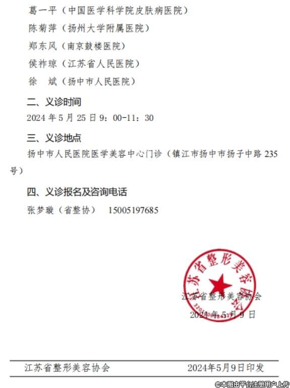 為貫徹落實(shí)黨中央健康中國(guó)戰(zhàn)略和國(guó)務(wù)院《全民科學(xué)素質(zhì)行動(dòng)計(jì)劃綱要》,發(fā)揮協(xié)會(huì)為民服務(wù)的宗旨,利用協(xié)會(huì)專(zhuān)家資源,為基層提供醫(yī)療技術(shù)支持,推動(dòng)當(dāng)?shù)蒯t(yī)學(xué)科學(xué)發(fā)展和人才培養(yǎng),提高當(dāng)?shù)厝嗣袢罕姷慕】狄庾R(shí)和健康水平,由江蘇省整形美容協(xié)會(huì)主辦、江蘇省整形美容協(xié)會(huì)面部年輕化分會(huì)、揚(yáng)中市人民醫(yī)院聯(lián)合承辦的專(zhuān)家義診定于2024年5月25日在揚(yáng)中舉辦,歡迎各位同仁的關(guān)注和參加。義診安排如下: