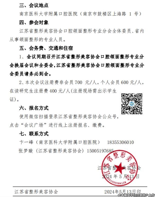 1、會議同期召開江蘇省整形美容協(xié)會口腔頜面整形專業(yè)分會換屆會議和全委會,江蘇省整形美容協(xié)會口腔頜面整形專業(yè)分會委員請務(wù)必到會。