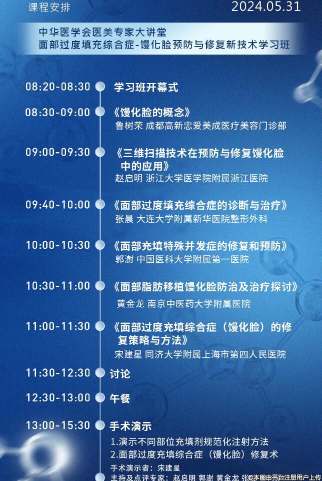 *“中華醫(yī)學(xué)會(huì)醫(yī)美專(zhuān)家大講堂暨中華醫(yī)學(xué)會(huì)第十九次醫(yī)學(xué)美容學(xué)術(shù)大會(huì)(會(huì)前會(huì))——面部過(guò)度充填綜合癥饅化臉預(yù)防與修復(fù)新技術(shù)學(xué)習(xí)班”參會(huì)議程