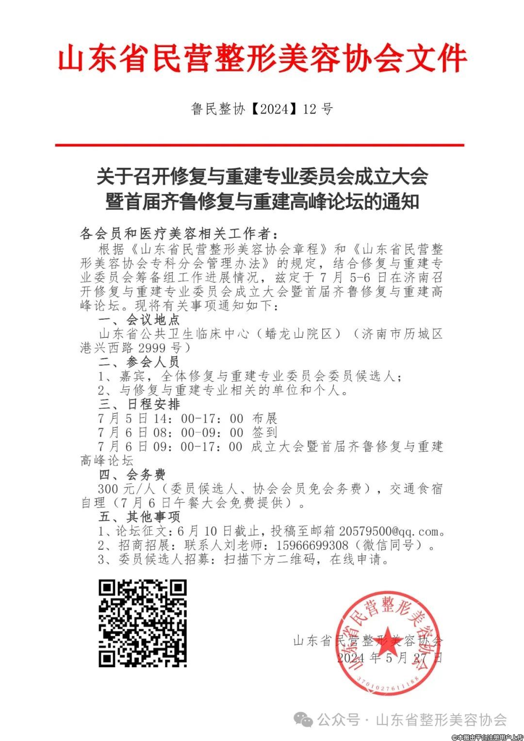 根據(jù)《山東省民營整形美容協(xié)會章程》和《山東省民營整形美容協(xié)會專科分會管理辦法》的規(guī)定,結(jié)合修復(fù)與重建專業(yè)委員會籌備組工作進(jìn)展情況,茲定于7月5-6日在濟南召開修復(fù)與重建專業(yè)委員會成立大會暨首屆齊魯修復(fù)與重建高峰論壇?,F(xiàn)將有關(guān)事項通知如下: