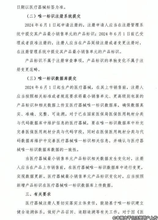 2024年6月1日起生產(chǎn)的醫(yī)療器械,在其上市銷(xiāo)售前,注冊(cè)人應(yīng)當(dāng)按照相關(guān)標(biāo)準(zhǔn)或者規(guī)范要求將最小銷(xiāo)售單元、更高級(jí)別包裝的產(chǎn)品標(biāo)識(shí)和相關(guān)數(shù)據(jù)上傳至醫(yī)療器械唯一標(biāo)識(shí)數(shù)據(jù)庫(kù),確保數(shù)據(jù)真實(shí)、準(zhǔn)傭元整中住國(guó)家醫(yī)休間醫(yī)休醫(yī)用老材與代碼數(shù)據(jù)庫(kù)中維護(hù)信息的醫(yī)療器械,要在唯一標(biāo)識(shí)數(shù)據(jù)庫(kù)中補(bǔ)充完善醫(yī)保醫(yī)用耗材分類(lèi)與代碼字段,同時(shí)在醫(yī)保醫(yī)用耗材分類(lèi)與代碼數(shù)據(jù)庫(kù)維護(hù)中完善醫(yī)療器械唯一標(biāo)識(shí)相關(guān)信息,并確認(rèn)與醫(yī)療器械唯一標(biāo)識(shí)數(shù)據(jù)庫(kù)數(shù)據(jù)的一致性。