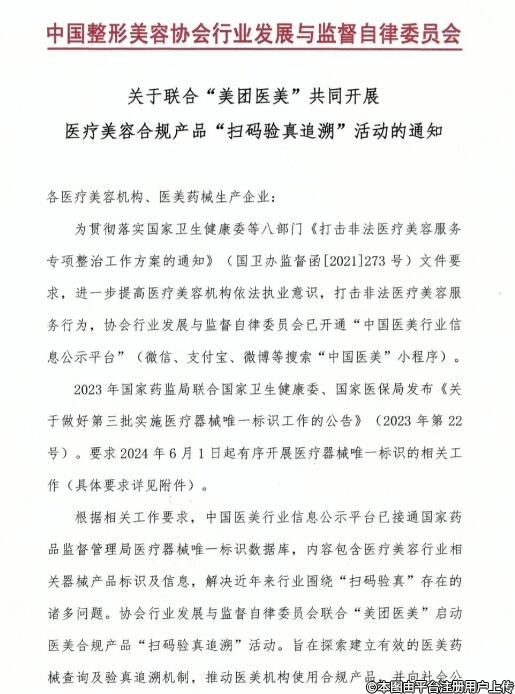 關(guān)于聯(lián)合“美團(tuán)醫(yī)美”共同開(kāi)展醫(yī)療美容合規(guī)產(chǎn)品“掃碼驗(yàn)真追溯”活動(dòng)的通知