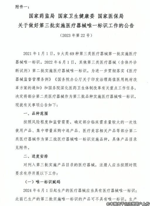2021年1月1日,9大類(lèi)69種第三類(lèi)醫(yī)療器第一批實(shí)施醫(yī)療器械唯一標(biāo)識(shí)。2022年6月1日,其他第三類(lèi)醫(yī)療器械(含體外診斷試劑)第二批實(shí)施醫(yī)療器械唯一標(biāo)識(shí)。為進(jìn)一步貫徹落實(shí)《醫(yī)療器械監(jiān)督管理?xiàng)l例》《國(guó)務(wù)院辦公廳關(guān)于印發(fā)治理高值醫(yī)用耗材改革方案的通知》和國(guó)務(wù)院深化醫(yī)藥衛(wèi)生體制改革有關(guān)重點(diǎn)工作任務(wù)決定將部分第二類(lèi)醫(yī)療器械作為第三批品種實(shí)施醫(yī)療器械唯一標(biāo)識(shí)現(xiàn)就有關(guān)事項(xiàng)公告如下: