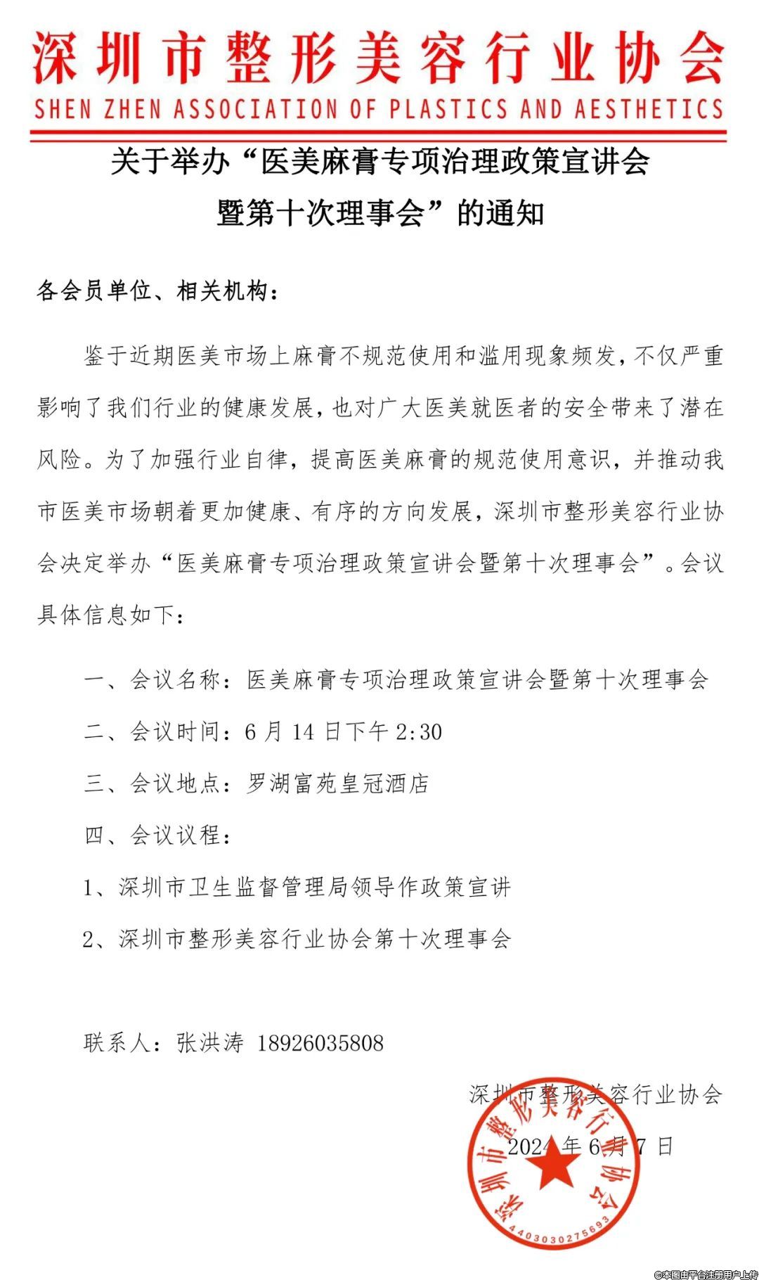 鑒于近期醫(yī)美市場上麻膏不規(guī)范使用和濫用現(xiàn)象頻發(fā),不僅嚴(yán)重影響了我們行業(yè)的健康發(fā)展,也對廣大醫(yī)美就醫(yī)者的安全帶來了潛在風(fēng)險。為了加強(qiáng)行業(yè)自律,提高醫(yī)美麻膏的規(guī)范使用意識,并推動我市醫(yī)美市場朝著更加健康、有序的方向發(fā)展,深圳市整形美容行業(yè)協(xié)會決定舉辦“醫(yī)美麻膏專項治理政策宣講會暨第十次理事會”。