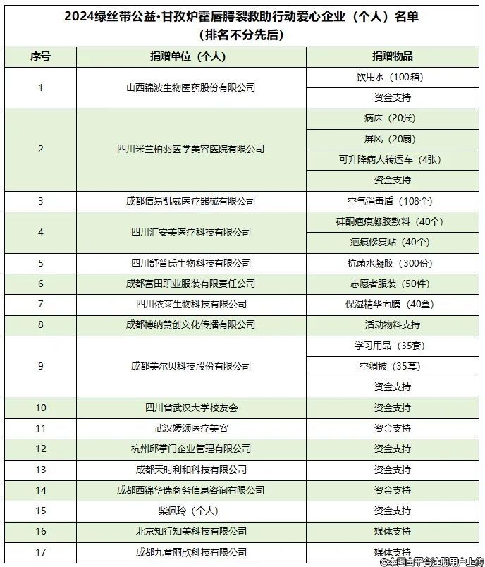 成都市醫(yī)療美容產(chǎn)業(yè)協(xié)會(huì)組織17家愛(ài)心企業(yè)開(kāi)展“2024綠絲帶公益·甘孜爐霍唇腭裂救助行動(dòng)”