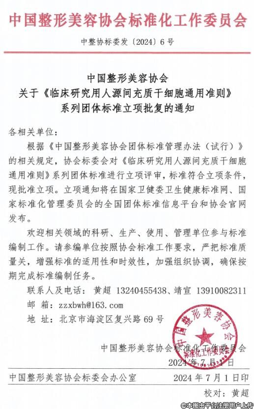 中國整形美容協(xié)會關于《臨床研究用人源間充質(zhì)干細胞通用準則》系列團體標準立項批復的通知