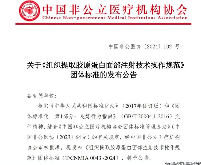 2024年7月6日上午,中國(guó)非公立醫(yī)療機(jī)構(gòu)協(xié)會(huì)整形與美容專委會(huì)(以下簡(jiǎn)稱專委會(huì))2024年度學(xué)術(shù)年會(huì)在武漢光谷會(huì)展中心成功召開。大會(huì)由專委會(huì)和中國(guó)整形美容協(xié)會(huì)醫(yī)美線技術(shù)分會(huì)(以下簡(jiǎn)稱線分會(huì))共同舉辦。在本次年會(huì)開幕式上,《組織提取膠原蛋白面部注射技術(shù)操作規(guī)范》團(tuán)體標(biāo)準(zhǔn)正式發(fā)布。