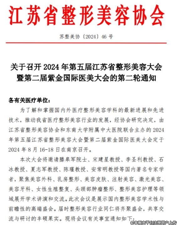 關(guān)于召開2024年第五屆江蘇省整形美容大會(huì)暨第二屆紫金國(guó)際醫(yī)美大會(huì)的第二輪通知