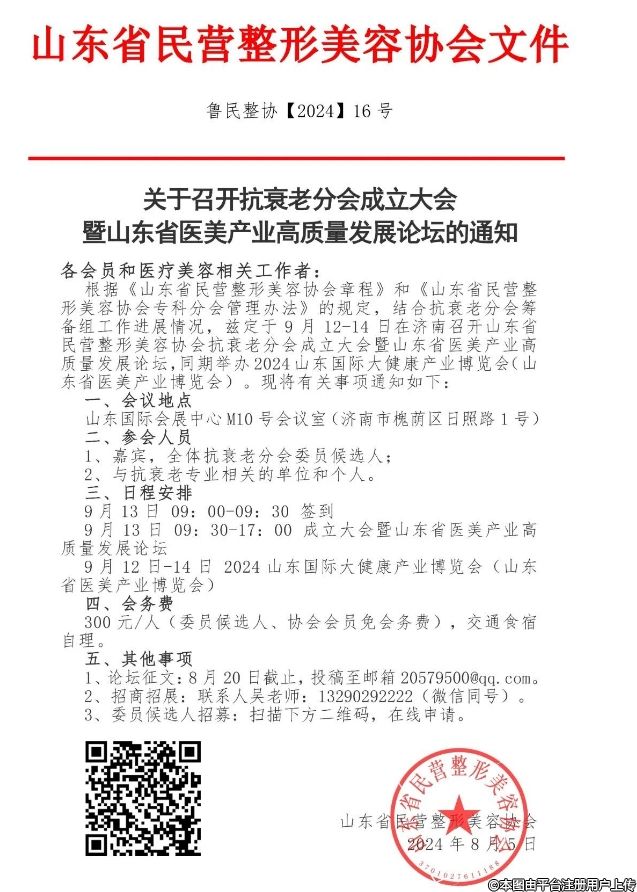 山東省民營(yíng)整形美容協(xié)會(huì)抗衰老分會(huì)成立大會(huì)暨山東省醫(yī)美產(chǎn)業(yè)高質(zhì)量發(fā)展論壇將于9月13日在濟(jì)南召開(kāi)