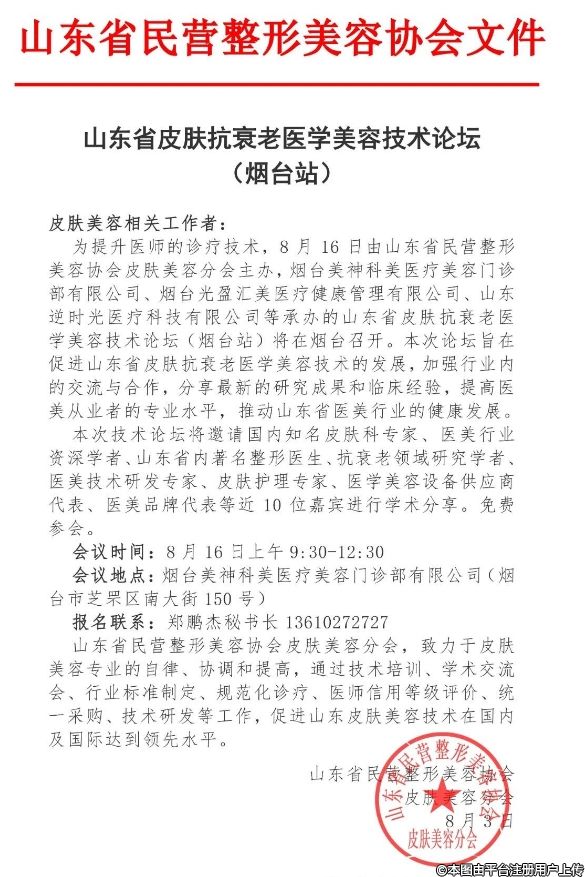 為提升醫(yī)師的診療技術(shù),8月16日由山東省民營整形美容協(xié)會皮膚美容分會主辦,煙臺美神科美醫(yī)療美容門診部有限公司、煙臺光盈匯美醫(yī)療健康管理有限公司、山東逆時光醫(yī)療科技有限公司等承辦的山東省皮膚抗衰老醫(yī)學(xué)美容技術(shù)論壇(煙臺站)將在煙臺召開。本次論壇旨在促進山東省皮膚抗衰老醫(yī)學(xué)美容技術(shù)的發(fā)展,加強行業(yè)內(nèi)的交流與合作,分享最新的研究成果和臨床經(jīng)驗,提高醫(yī)美從業(yè)者的專業(yè)水平,推動山東省醫(yī)美行業(yè)的健康發(fā)展。