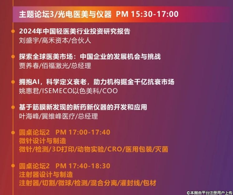 據(jù)悉,本次大會將從安全規(guī)范與市場準(zhǔn)入、注射醫(yī)美與應(yīng)用、光電醫(yī)美與儀器、多醫(yī)美融合與創(chuàng)新、項目路演與融資等六大領(lǐng)域開展論壇,進(jìn)行深入研討與交流,加速國內(nèi)醫(yī)美生態(tài)圈建設(shè),全面、深度剖析、展望高端醫(yī)美器械的現(xiàn)狀與未來,助力醫(yī)美賽道健康與穩(wěn)定發(fā)展。其中安全規(guī)范與市場準(zhǔn)入論壇將會邀請相關(guān)主管部門領(lǐng)導(dǎo)解析政策,同時圍繞安全、合規(guī)、注冊、動物實驗、檢測、準(zhǔn)入等層面進(jìn)行探討;注射醫(yī)美與應(yīng)用論壇則緊扣醫(yī)美材料、器械和醫(yī)美方案進(jìn)行研究;光電醫(yī)美與儀器論壇將深入探討光電醫(yī)美產(chǎn)業(yè)市場發(fā)展最新趨勢和機(jī)會,并就微針和注射器的設(shè)計與制造全產(chǎn)業(yè)鏈展開討論;多醫(yī)美融合與創(chuàng)新論壇將就多醫(yī)美與智能家居領(lǐng)域展開分析與展望;而項目路演與融資將搭建醫(yī)美產(chǎn)業(yè)企業(yè)與投資機(jī)構(gòu)交流平臺,促使資本與產(chǎn)業(yè)融合,助力醫(yī)美產(chǎn)業(yè)進(jìn)一步高速發(fā)展,目前佰福激光、呈諾醫(yī)學(xué)、翼維峰醫(yī)療、繡麗醫(yī)藥、新世元生物、藍(lán)皓生物等超過10家企業(yè)已報名參與。