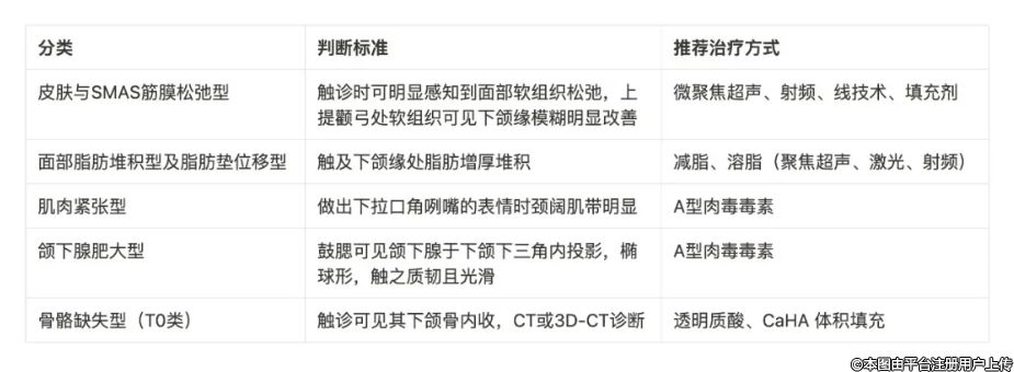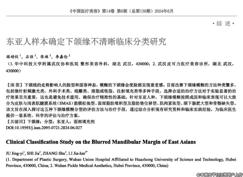 摘要:下頜線的走勢影響人的臉型和面容神態(tài),模糊的下頜緣會使臉部呈現(xiàn)衰老感。目前改善下頜緣模糊的方法種類繁多,包括微針射頻激光“類、外科手術類、線雕類、溶脂或吸脂、注射填充類等多種手段。選擇合適的治療方法對于實驗顯著的治療效果至關重要,這也是避免技術濫用、確保治療精準性的基礎。針對東亞人種,下頜緣模糊按照成因和臨床表現(xiàn)可以大致分為皮膚與淺表肌腱膜系統(tǒng)(SMAS)筋膜松弛型、面部脂肪堆積型及脂肪墊位移型、肌肉緊張型、頜下腺肥大型和骨骼缺失型。該文旨在深入探討這五種下頜緣模糊分型的評估方法與治療手段,通過綜合分析現(xiàn)有研究資料和臨床實踐經(jīng)驗,為臨床醫(yī)生提供一套系統(tǒng)、科學的評估與治療方案。