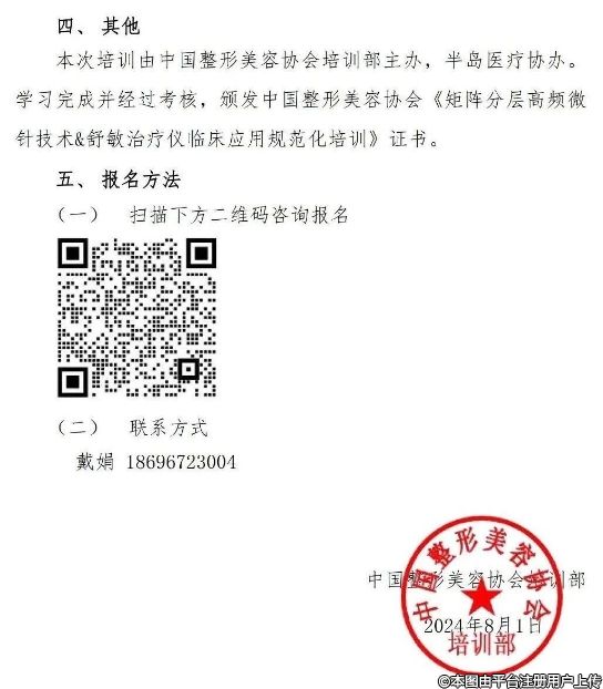 本次培訓(xùn)由中國整形美容協(xié)會培訓(xùn)部主辦,半島醫(yī)療協(xié)辦。學(xué)習(xí)完成并經(jīng)過考核,頒發(fā)中國整形美容協(xié)會《矩陣分層高頻微針技術(shù)&舒敏治療儀臨床應(yīng)用規(guī)范化培訓(xùn)》證書。