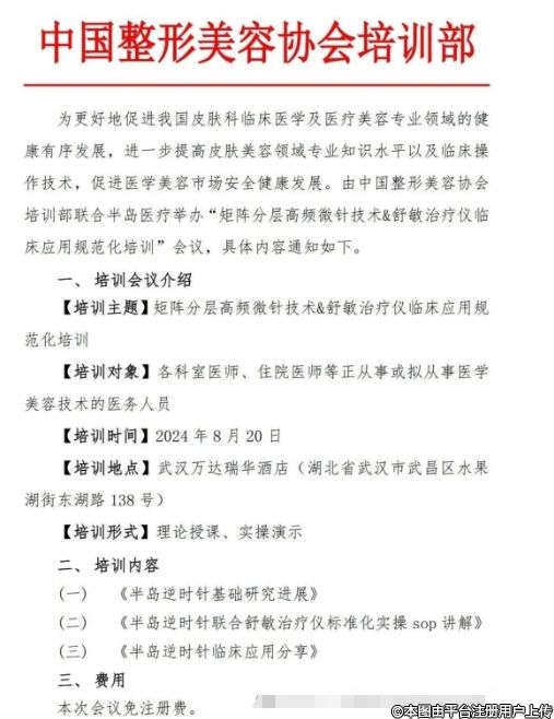 為更好地促進(jìn)我國皮膚科臨床醫(yī)學(xué)及醫(yī)療美容專業(yè)領(lǐng)域的健康有序發(fā)展,進(jìn)一步提高皮膚美容領(lǐng)域?qū)I(yè)知識水平以及臨床操作技術(shù),促進(jìn)醫(yī)學(xué)美容市場安全健康發(fā)展。由中國整形美容協(xié)會培訓(xùn)部聯(lián)合半島醫(yī)療舉辦“矩陣分層高頻微針技術(shù)&舒敏治療儀臨床應(yīng)用規(guī)范化培訓(xùn)”會議,具體內(nèi)容通知如下,