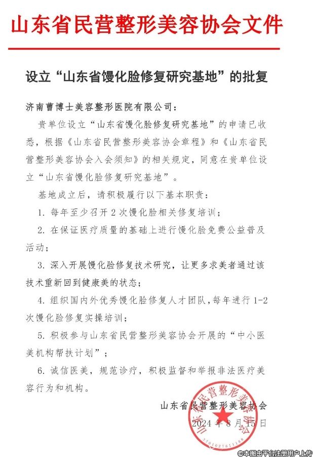 貴單位設(shè)立“山東省饅化臉修復(fù)研究基地”的申請已收悉,根據(jù)《山東省民營整形美容協(xié)會章程》和《山東省民營整形美容協(xié)會入會須知》的相關(guān)規(guī)定,同意在貴單位設(shè)立“山東省饅化臉修復(fù)研究基地”