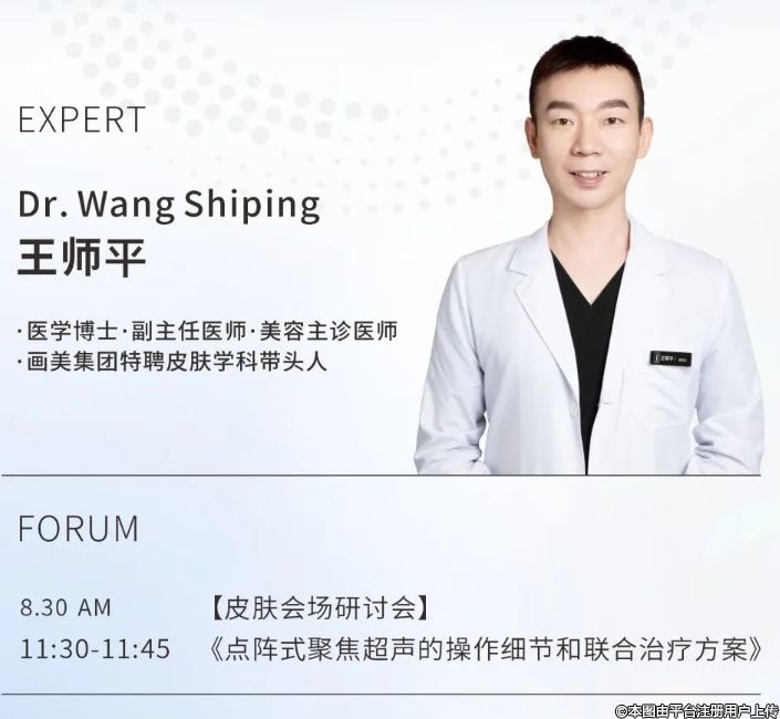 8月30日11:30-11:45,在西安國際會展中心會議樓二樓多功能廳C美容皮膚會場,畫美集團特聘皮膚學(xué)科帶頭人王師平博士將以《點陣式聚焦超聲的操作細(xì)節(jié)和聯(lián)合治療方案》為主題進(jìn)行現(xiàn)場分享,為與會嘉賓帶來更精煉的超聲王技術(shù)理論知識,及更實用的臨床應(yīng)用經(jīng)驗。