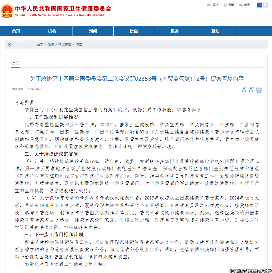 據(jù)國家衛(wèi)生健康委網(wǎng)站8月28日消息,對于全國政協(xié)委員肖苒《關(guān)于規(guī)范醫(yī)美直播業(yè)態(tài)的提案》,國家衛(wèi)健委從持續(xù)規(guī)范醫(yī)療美容行業(yè)、鼓勵(lì)有資質(zhì)的專業(yè)人員開展權(quán)威健康科普等方面予以答復(fù)。