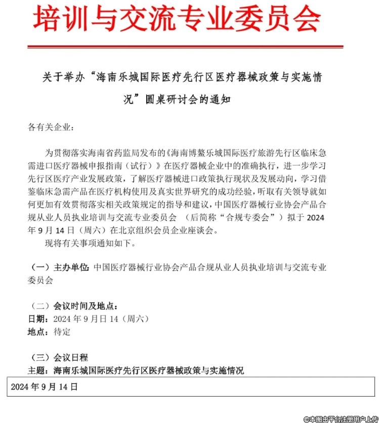 為貫徹落實海南省藥監(jiān)局發(fā)布的《海南博鰲樂城國際醫(yī)療旅游先行區(qū)臨床急需進口醫(yī)療器械中報指南(試行)》在醫(yī)療器企業(yè)中的準(zhǔn)確執(zhí)行,進一步學(xué)習(xí)先行區(qū)醫(yī)療產(chǎn)業(yè)發(fā)展政策,了解醫(yī)療器械進口政策執(zhí)行現(xiàn)狀及發(fā)展動向,學(xué)習(xí)借鑒臨床急需產(chǎn)品在醫(yī)療機構(gòu)使用及真實世界研究的成功經(jīng)驗,聽取有關(guān)領(lǐng)導(dǎo)就如何更加有效貫徹落實相關(guān)政策規(guī)定的指導(dǎo)和建議,中國醫(yī)療器械行業(yè)協(xié)會產(chǎn)品合規(guī)從業(yè)人員執(zhí)業(yè)培訓(xùn)與交流專業(yè)委員會(后簡稱“合規(guī)專委會”)擬于2024年9月14日(周六)在北京組織會員企業(yè)座談會。