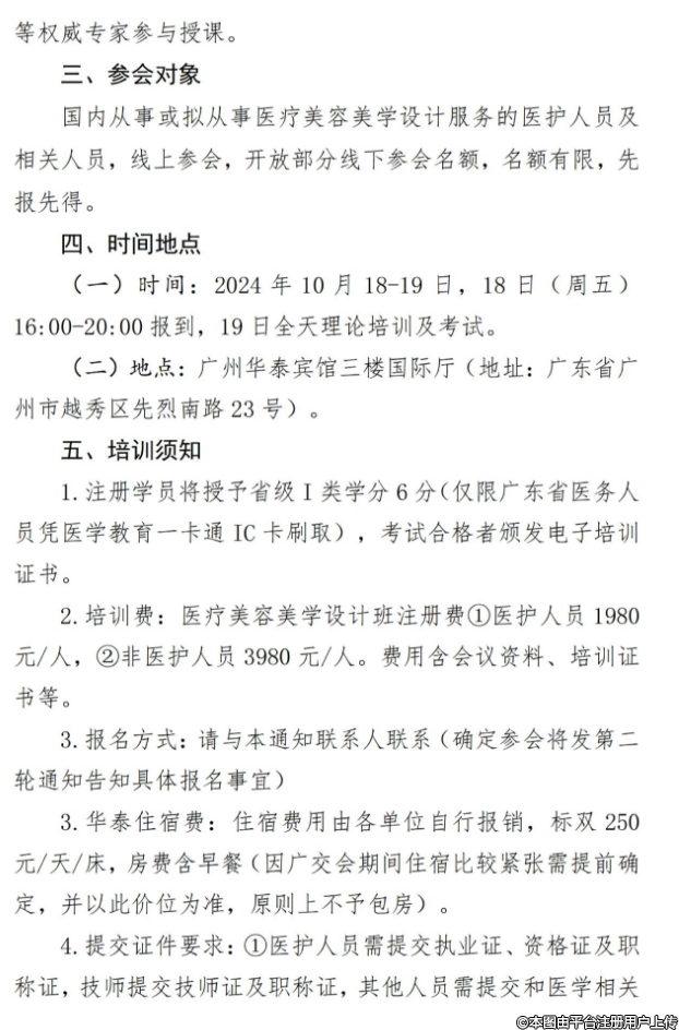 2.培訓費:醫(yī)療美容美學設(shè)計班注冊費①醫(yī)護人員 1980元/人,②非醫(yī)護人員 3980元/人。費用含會議資料、培訓證書等。