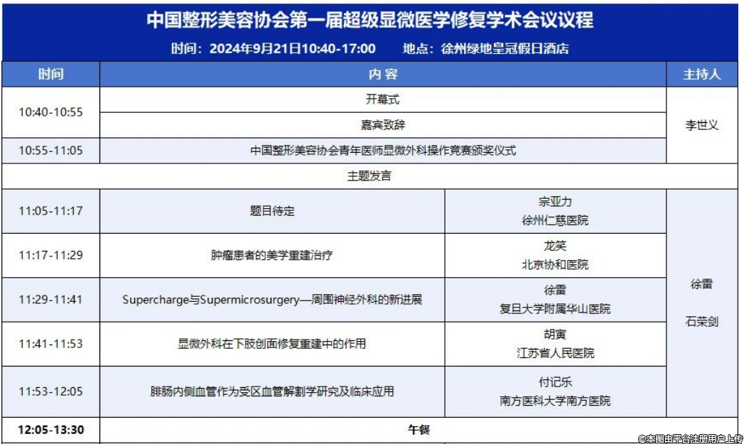 2024年9月20-21日,由中國整形美容協(xié)會主辦、徐州仁慈醫(yī)院承辦的中國整形美容協(xié)會超顯微醫(yī)學(xué)修復(fù)分會成立大會暨第一屆超級顯微醫(yī)學(xué)修復(fù)學(xué)術(shù)交流會即將在徐州隆重召開。