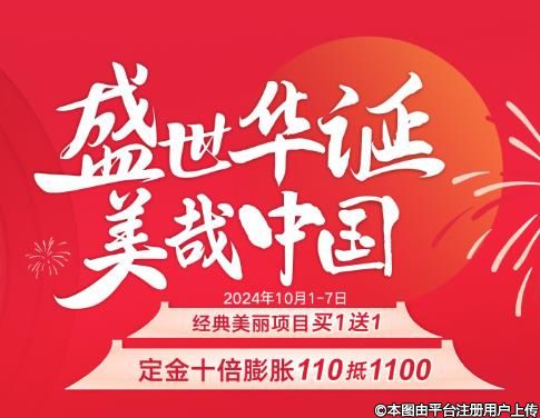 盛世華誕,美哉中國,烏魯木齊華美給大家送美容福利啦,在國慶期間,經(jīng)典美麗項目買一送一,定金十倍膨脹,110元抵1100元,超值福利,大家還在等什么呢?