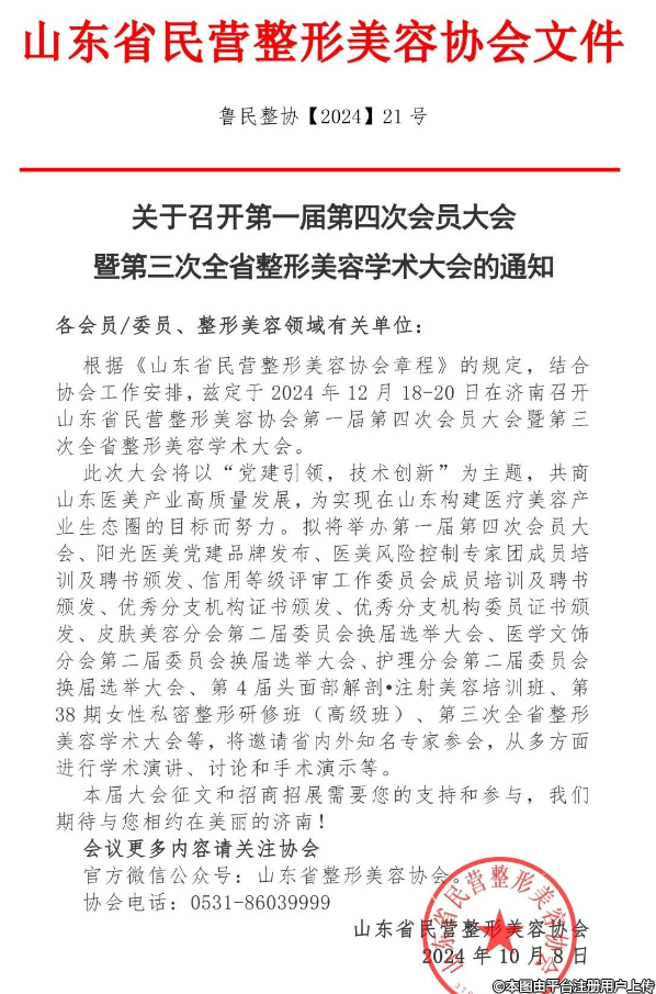 根據(jù)《山東省民營整形美容協(xié)會章程》的規(guī)定,結(jié)合協(xié)會工作安排,茲定于2024年12月18-20日在濟南召開山東省民營整形美容協(xié)會第一屆第四次會員大會暨第三次全省整形美容學(xué)術(shù)大會。