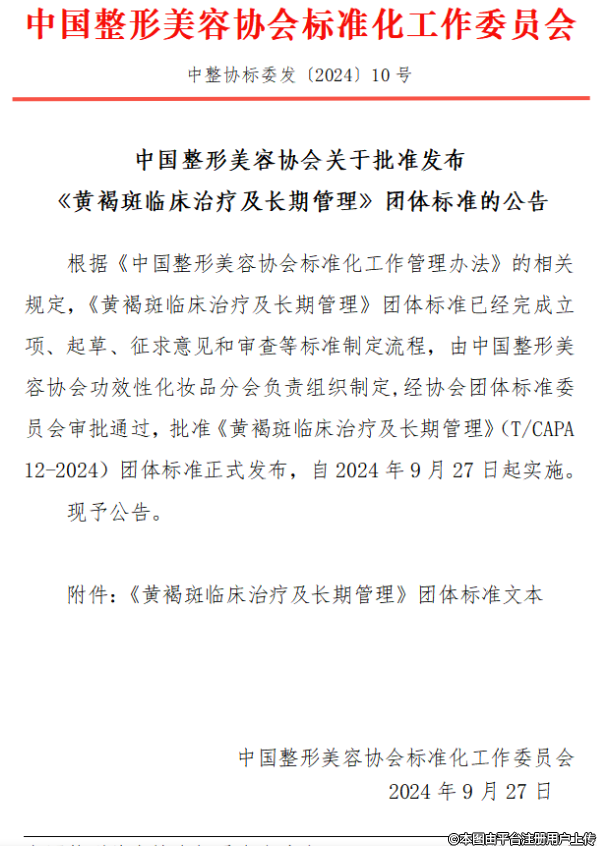 《黃褐斑臨床治療及長(zhǎng)期管理》團(tuán)體標(biāo)準(zhǔn)的公告根據(jù)《中國(guó)整形美容協(xié)會(huì)標(biāo)準(zhǔn)化工作管理辦法》的相關(guān)規(guī)定,《黃褐斑臨床治療及長(zhǎng)期管理》團(tuán)體標(biāo)準(zhǔn)已經(jīng)完成立項(xiàng)、起草、征求意見和審查等標(biāo)準(zhǔn)制定流程,由中國(guó)整形美容協(xié)會(huì)功效性化妝品分會(huì)負(fù)責(zé)組織制定,經(jīng)協(xié)會(huì)團(tuán)體標(biāo)準(zhǔn)委員會(huì)審批通過(guò),批準(zhǔn)《黃褐斑臨床治療及長(zhǎng)期管理》(T/CAPA12-2024)團(tuán)體標(biāo)準(zhǔn)正式發(fā)布,自2024年9月27日起實(shí)施。