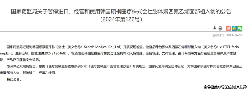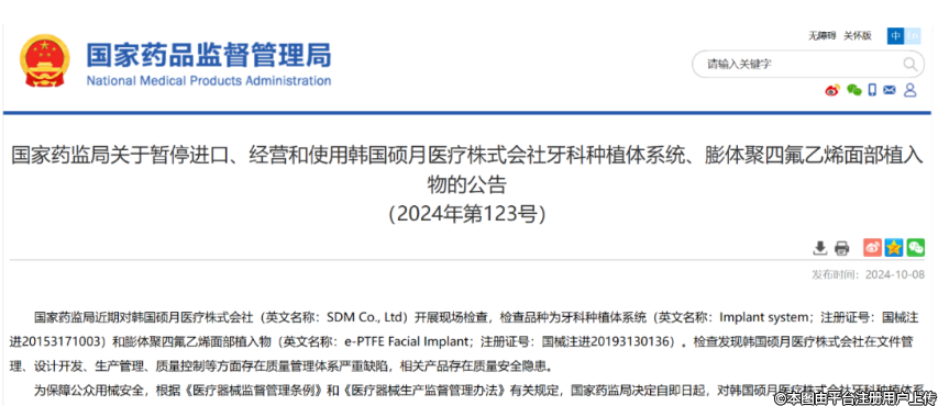 10月8日,國(guó)家藥監(jiān)局官網(wǎng)接連發(fā)布了兩個(gè)公告:《國(guó)家藥監(jiān)局關(guān)于暫停進(jìn)口、經(jīng)營(yíng)和使用韓國(guó)碩祺醫(yī)療株式會(huì)社膨體聚四氟乙烯面部植入物的公告(2024年第122號(hào))》、《國(guó)家藥監(jiān)局關(guān)于暫停進(jìn)口、經(jīng)營(yíng)和使用韓國(guó)碩月醫(yī)療株式會(huì)社牙科種植體系統(tǒng)、膨體聚四氟乙烯面部植入物的公告(2024年第123號(hào))》。