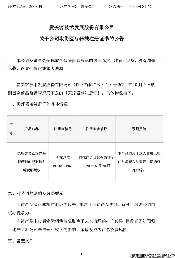 愛美客10月9日晚間發(fā)布公告稱,愛美客技術(shù)發(fā)展股份有限公司于2024年10月9日收到國(guó)家藥品監(jiān)督管理局下發(fā)的《醫(yī)療器械注冊(cè)證》。產(chǎn)品名稱為“醫(yī)用含聚乙烯醇凝膠微球的交聯(lián)透明質(zhì)酸鈉凝膠”。