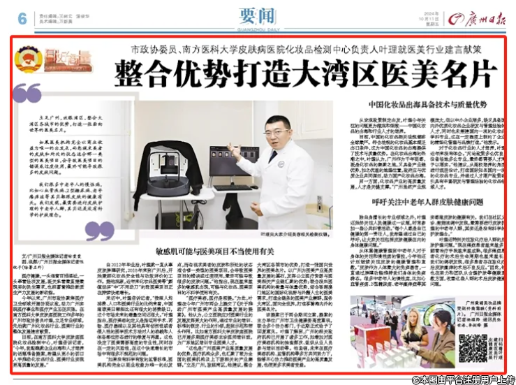 10月11日,廣州日報刊登《整合優(yōu)勢打造大灣區(qū)醫(yī)美名片》一文,專訪廣州市政協(xié)委員、南方醫(yī)科大學(xué)皮膚病醫(yī)院化妝品檢測中心負(fù)責(zé)人葉理就醫(yī)美行業(yè)建言獻策?,F(xiàn)轉(zhuǎn)載全文報道,以饗讀者。