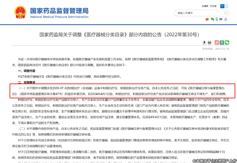 2022年3月,國(guó)家藥監(jiān)局發(fā)布公告,將射頻治療(非消融)設(shè)備如”射頻治療儀、射頻皮膚治療儀“作為第三類醫(yī)療器械管理。2024年7月8日,國(guó)家藥品監(jiān)督管理局對(duì)外宣布,對(duì)射頻美容儀施行的第三類醫(yī)療器械管理的規(guī)定,延期到2026年4月實(shí)施。