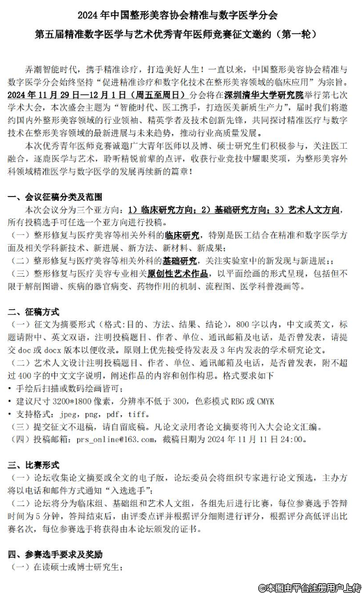2024年中國整形美容協(xié)會精準與數(shù)字醫(yī)學分會第五屆精準數(shù)字醫(yī)學與藝術優(yōu)秀青年醫(yī)師競賽征文邀約(第一輪)弄潮智能時代,攜手精準診療,打造美好人生!一直以來,中國整形美容協(xié)會精準與數(shù)字醫(yī)學分會始終堅持“促進精準診療和數(shù)字化技術在整形美容領域的臨床應用”為宗旨。2024年11月29日—12月1日(周五至周日)分會將在深圳清華大學研究院舉行第七次學術大會,本次盛會主題為“智能時代、醫(yī)工攜手,打造醫(yī)美新質(zhì)生產(chǎn)力”,屆時我們將邀約國內(nèi)外整形美容領域的行業(yè)領袖、精英學者及技術創(chuàng)新先鋒,共同探討精準醫(yī)療與數(shù)字技術在整形美容領域的最新進展與未來趨勢,推動行業(yè)高質(zhì)量發(fā)展。本次優(yōu)秀青年醫(yī)師競賽誠邀廣大青年醫(yī)師以及博、碩士研究生們積極參與,關注醫(yī)工融合,逐鹿醫(yī)學與藝術,聆聽精銳前輩的點評,收獲行業(yè)競技中耀眼獎項,為整形美容外科領域精準醫(yī)學與數(shù)字醫(yī)學的發(fā)展再續(xù)新的篇章!1會議征稿分類及范圍