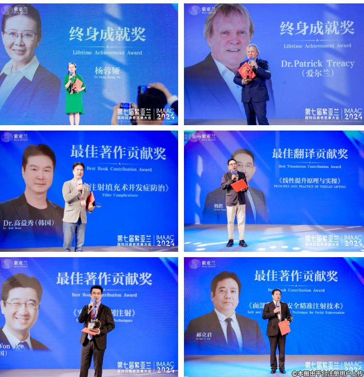 活動現(xiàn)場,楊蓉婭教授、俄羅斯Dr./Prof. Natalia Manturova、俄羅斯Dr.Akhmed Rakhimov、愛爾蘭Dr.Patrick Treacy榮獲“終身成就獎”,郝立君教授、楊高云教授、德國Dr.Bernd Kleine Gunk等榮獲“最佳著作貢獻獎”,羅盛康教授、吳曉軍教授等榮獲“最佳翻譯貢獻獎”。他們的成就不僅體現(xiàn)在醫(yī)美領(lǐng)域的學(xué)術(shù)貢獻上,更在于通過著書立說,推動了醫(yī)美知識的普及與技術(shù)的進步,為全球醫(yī)美行業(yè)的發(fā)展注入了源源不斷的動力。