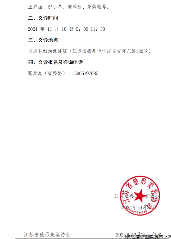 為貫徹落實(shí)黨中央健康中國戰(zhàn)略和國務(wù)院《全民科學(xué)素質(zhì)行動(dòng)計(jì)劃綱要》,發(fā)揮協(xié)會(huì)為民服務(wù)的宗旨,利用協(xié)會(huì)專家資源為基層提供醫(yī)療技術(shù)支持,推動(dòng)當(dāng)?shù)蒯t(yī)學(xué)科學(xué)發(fā)展和人才培養(yǎng),提高當(dāng)?shù)厝嗣袢罕姷慕】狄庾R和健康水平,由江蘇省整形美容協(xié)會(huì)主辦、江蘇省整形美容協(xié)會(huì)面部輪廓與畸形分會(huì)、寶應(yīng)縣婦幼保健院聯(lián)合承辦的專家義診定于2024年11月10 日在寶應(yīng)縣婦幼保健院舉辦,歡迎各位同仁的關(guān)注和參加。義診安排如下: