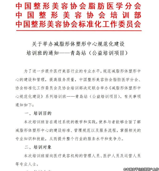 為了進(jìn)一步提升醫(yī)療美容行業(yè)的專(zhuān)業(yè)水平,規(guī)范減脂形體塑形中心的建設(shè)和管理,提高服務(wù)質(zhì)量,中國(guó)整形美容協(xié)會(huì)脂肪醫(yī)學(xué)分會(huì)協(xié)會(huì)標(biāo)準(zhǔn)化工作委員會(huì)及協(xié)會(huì)培訓(xùn)部決定聯(lián)合舉辦《減脂形體塑形中心規(guī)范化建設(shè)》系列培訓(xùn)班--青島站(公益培訓(xùn)項(xiàng)目)。有關(guān)事項(xiàng)通知如下: