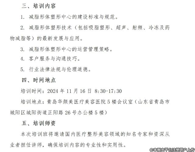 培訓(xùn)時(shí)間:2024年11月16日8:30-17:30培訓(xùn)地點(diǎn):青島華顏美醫(yī)療美容醫(yī)院5樓會(huì)議室(山東省青島市城陽(yáng)區(qū)城陽(yáng)街道正陽(yáng)路 26 號(hào)辦公樓5樓)五、培訓(xùn)師資