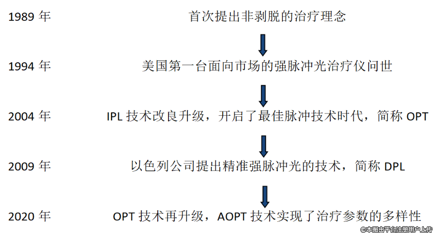 這與強(qiáng)脈沖光的技術(shù)迭代密切相關(guān),縱觀強(qiáng)脈沖光的發(fā)展史: