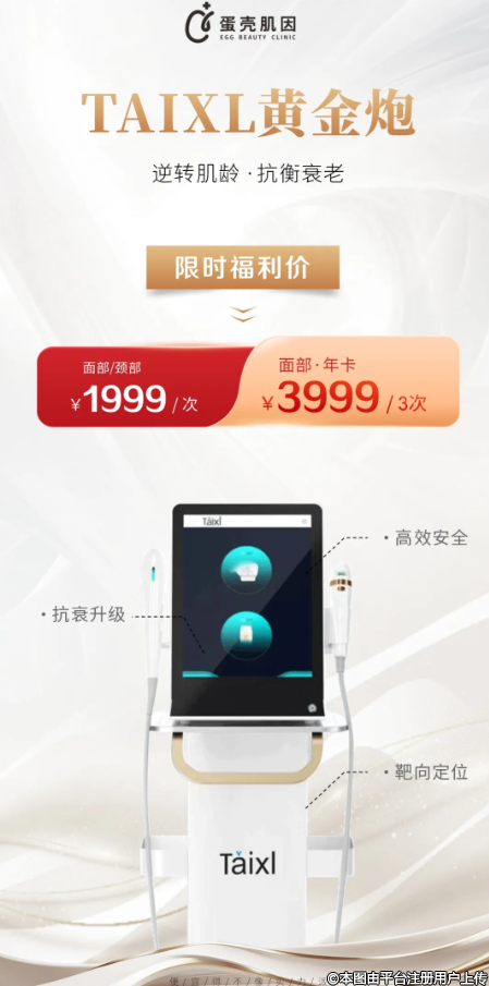 福利價(jià)一樣安排上!Taixl黃金炮面部/頸部單次體驗(yàn)價(jià)僅需1999元,更有3999元的面部年卡(3次),折算下來(lái)一次僅需1333元!