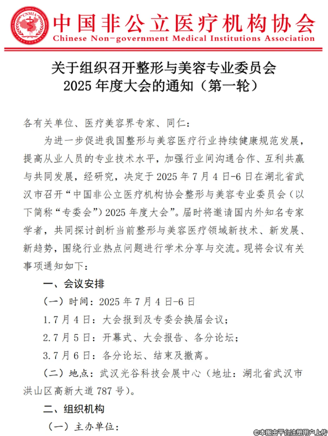 為進一步促進我國整形與美容醫(yī)療行業(yè)持續(xù)健康規(guī)范發(fā)展,提高從業(yè)人員的專業(yè)技術(shù)水平,加強行業(yè)間溝通合作、互利共贏與共同發(fā)展,經(jīng)研究,決定于2025年7月4日-6日在湖北省武漢市召開“中國非公立醫(yī)療機構(gòu)協(xié)會整形與美容專業(yè)委員會(以下簡稱“專委會”)2025 年度大會”。屆時將邀請國內(nèi)外知名專家學(xué)者,共同探討剖析當(dāng)前整形與美容醫(yī)療領(lǐng)域新技術(shù)、新發(fā)展新趨勢,圍繞行業(yè)熱點問題進行學(xué)術(shù)分享與交流?,F(xiàn)將會議有關(guān)事項通知如下: