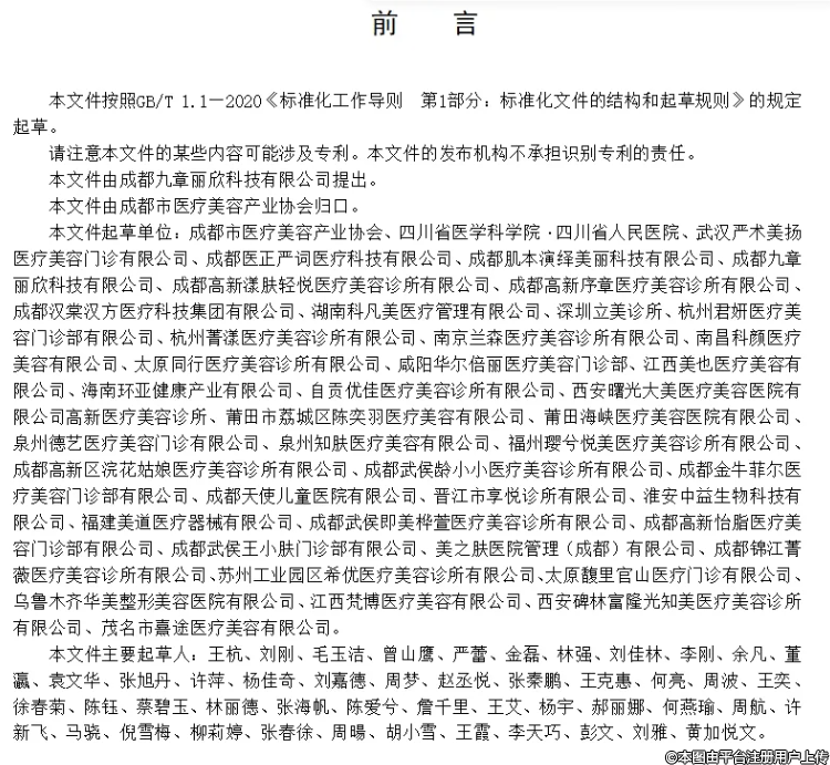 該規(guī)范由成都九章麗欣科技有限公司提出,成都市醫(yī)療美容產(chǎn)業(yè)協(xié)會歸口,并聯(lián)合四川省醫(yī)學科學院·四川省人民醫(yī)院、武漢嚴術(shù)美揚醫(yī)療美容門診有限公司、成都醫(yī)正嚴詞醫(yī)療科技有限公司、成都肌本演繹美麗科技有限公司、成都九章麗欣科技有限公司、成都高新漾膚輕悅醫(yī)療美容診所有限公司、成都高新序章醫(yī)療美容診所有限公司等多家單位共同起草。其起草過程嚴格遵循 GB/T 1.1—2020《標準化工作導則 第 1 部分:標準化文件的結(jié)構(gòu)和起草規(guī)則》的規(guī)定,凝聚了眾多業(yè)內(nèi)權(quán)威專家的專業(yè)智慧與豐富經(jīng)驗,全面涵蓋了術(shù)后修復等全流程的細致準則。