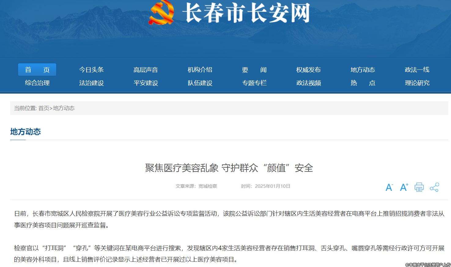 日前,長春市寬城區(qū)人民檢察院開展了醫(yī)療美容行業(yè)公益訴訟專項監(jiān)督活動,該院公益訴訟部門針對轄區(qū)內(nèi)生活美容經(jīng)營者在電商平臺上推銷招攬消費者非法從事醫(yī)療美容項目問題展開巡查監(jiān)督。