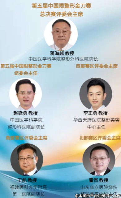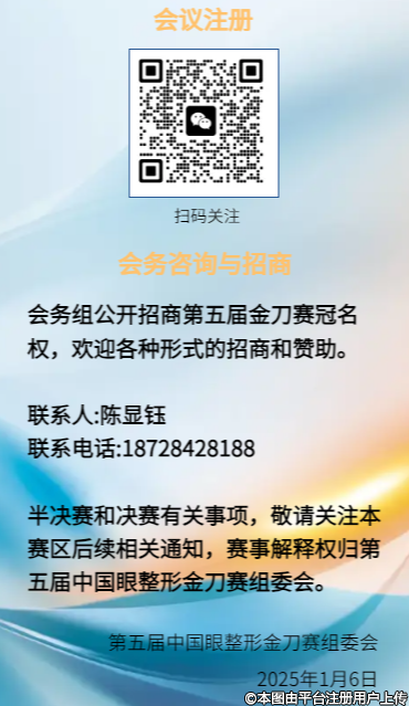 3、全國總決賽規(guī)則總決賽時(shí)間初步定于2025年9~10月在北京舉行:每個(gè)半決賽區(qū)晉級單位和個(gè)人(共15名醫(yī)生),在規(guī)定的時(shí)間,在注冊執(zhí)業(yè)地點(diǎn),將比賽手術(shù)實(shí)況視頻向大會輸出,會場大屏直播手術(shù)視頻,由會場專家評委和參會醫(yī)生評委,采用共同現(xiàn)場評分方法,依據(jù)得分高低排序,評選出2025年度中國眼整形金刀賽金刀獎(jiǎng),同時(shí)評選出全國眼整形優(yōu)勝單位和個(gè)人,并頒發(fā)獎(jiǎng)牌和書。