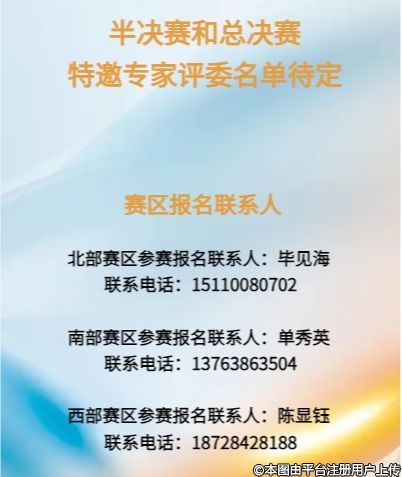 所有參賽單位和個(gè)人上報(bào)材料,將由大會學(xué)術(shù)秘書處進(jìn)行初步篩選審核,初篩后由專家進(jìn)行評分,最后評選出每個(gè)半決賽區(qū)前15名單位和個(gè)人進(jìn)入半決賽。