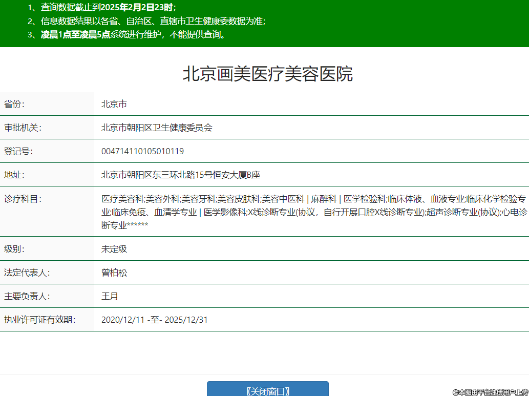 北京畫美醫(yī)療美容成立于2004年,是當(dāng)?shù)乩吓频尼t(yī)療美容機(jī)構(gòu)。小編還在衛(wèi)健委官網(wǎng)查詢到了其資質(zhì),確實(shí)是正規(guī)的整形美容??漆t(yī)院。具體查詢結(jié)果也為大家放上了,請(qǐng)看▼