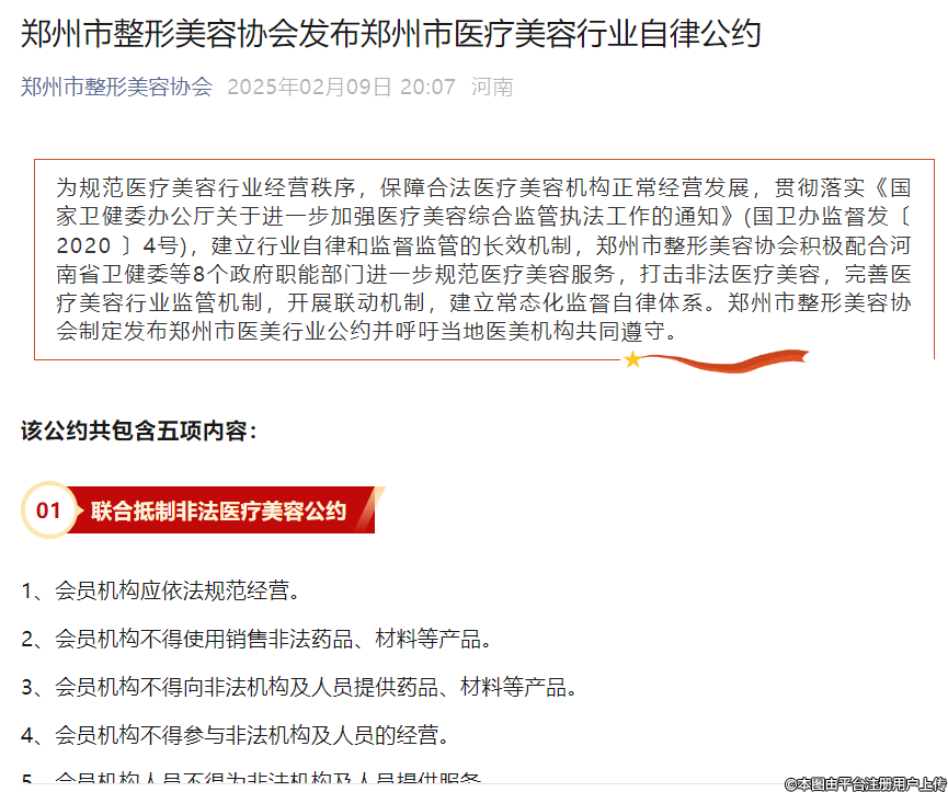 近日,鄭州市整形美容協(xié)會制定發(fā)布鄭州市醫(yī)美行業(yè)公約并呼吁當(dāng)?shù)蒯t(yī)美機構(gòu)共同遵守。該公約共包含五項內(nèi)容: