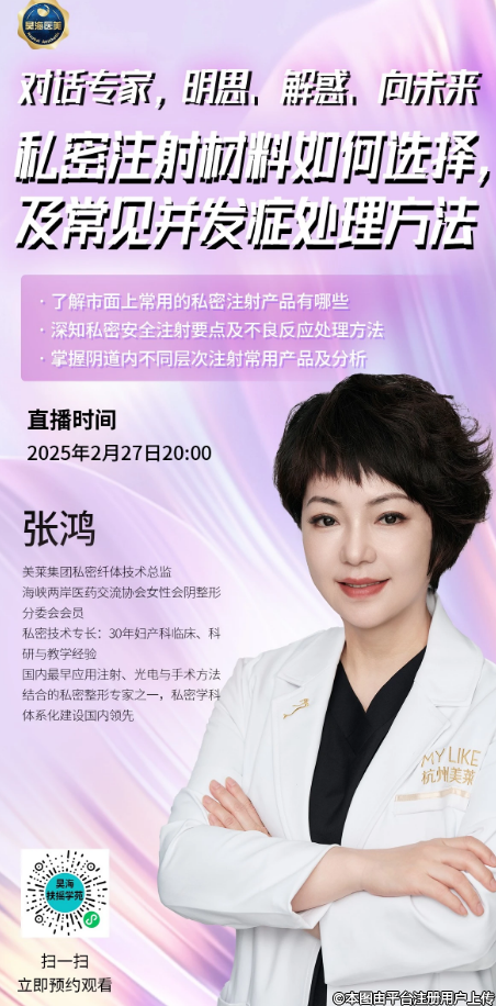 本次直播特邀張鴻教授帶來私密注射常見的注射材料及其特點(diǎn)和不良反應(yīng)處理辦法。深度探討如何避免陰道注射引起的嚴(yán)重并發(fā)癥。進(jìn)一步研究私密注射材料治療生殖器整形和保養(yǎng)的方法,并規(guī)范操作,使更多的求美者受益。