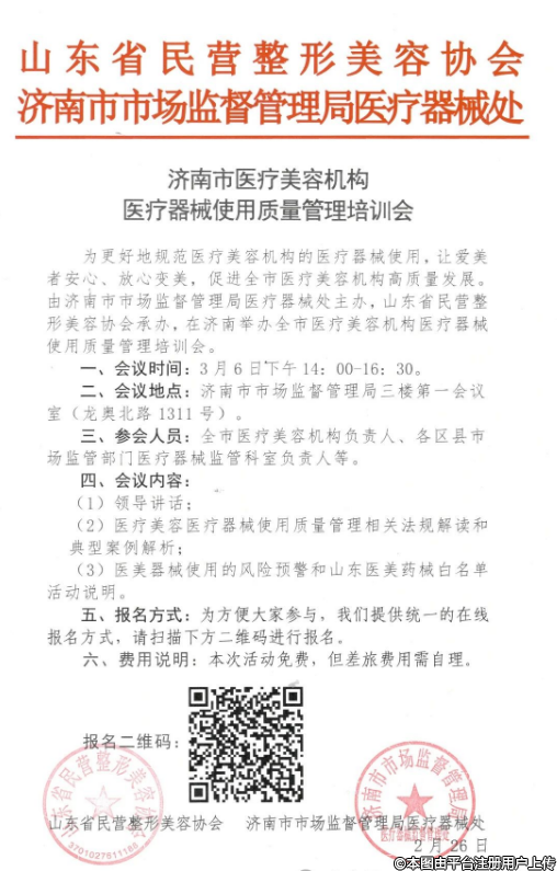 為更好地規(guī)范醫(yī)療美容機構(gòu)的醫(yī)療器械使用,讓愛美者安心、放心變美,促進全市醫(yī)療美容機構(gòu)高質(zhì)量發(fā)展。由濟南市市場監(jiān)督管理局醫(yī)療器械處主辦,山東省民營整形美容協(xié)會承辦,在濟南舉辦全市醫(yī)療美容機構(gòu)醫(yī)療器械使用質(zhì)量管理培訓會。
